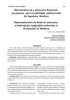 Descentralizarea şi autonomia financiară: o provocare pentru autorităţile publice locale din Republica Moldova Acest articol reflectă procesul de descentralizare, ce are loc actualmente în Republica Moldova. Scopul cercetării este de a familiariza cititorii cu conceptul fundamental al descentralizării, cu domeniile de descentralizare administrativă, cu formele de manifestare a descentralizării financiare: descentralizare fiscală şi descentralizare bugetară. Sunt identificate priorităţile procesului de descentralizare.