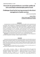 Provocări ale gestiunii directe a serviciilor publice de către autorităţile administraţiei publice locale În prezentul articol autorul studiază provocările gestiunii directe a serviciilor publice locale, prin gestiune directă înţelegând regimul în care administraţia publică, în general, şi administraţia publică locală, în particular, joacă rolul principal atât în organizarea, cât şi în gestionarea serviciilor publice. Deşi aceste provocări sunt, în general, constante, indiferent de perioada analizată, modul în care administraţia publică locală face faţă acestor provocări variază, ea găsind soluţii atât tradiţionale, cât şi inventive.