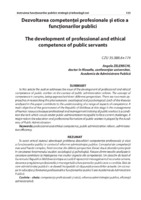 Dezvoltarea competenței profesionale și etice a funcționarilor publici În acest articol autorul abordează problema dezvoltării competenței profesionale și etice a funcționarilor publici în contextul reformei administrației publice. Conceptul de competență este unul foarte complex, fiind cercetat din diferite perspective. Există două abordări principale în cercetarea fenomenului studiat: sociologică și psihologică. Fiecare dintre teoriile analizate în cercetare contribuie la înțelegerea mai multor aspecte ale competenței. Un obiectiv de bază al Guvernului Republicii Moldova la etapa actuală îl reprezintă managementul resurselor umane, deoarece pregătirea profesională și managerială a funcționarilor publici este o condiție, fără de care administrația publică s-ar dovedi incapabilă să răspundă provocărilor actuale. Un rol major în educația și formarea profesională a funcționarilor publici îl are Academia de Administrare Publică.