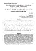 Semnificațiile intereselor publice în contextul câmpului politic-administrativ În acest articol sunt examinate unele semnificații valorice ale intereselor publice în contextul câmpului politic și administrativ. Autorul acordă o atenție deosebită aspectelor conceptuale, structurale și stadiale ale intereselor publice, precum și purtătorilor de interese publice. În Republica Moldova, prin acest studiu, sunt abordate pentru prima dată interesele publice din prisma dimensiunilor de câmp politic și administrativ. Este o primă încercare de a analiza mecanismul relației interese publice - câmp politic și administrativ în condițiile tranziției spre democrație. În acest sens, sunt identificate punctele de tangență între interese și câmp, determinările și interacțiunile între ele. Articolul are atât semnificație teoretică, precum și practică. Aspectele practice rezultă îndeosebi din experiența vieții politice și publice a Republicii Moldova.
