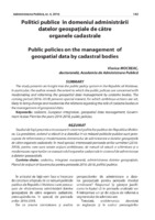 Politici publice în domeniul administrării datelor geospațiale de către organele cadastrale Studiul de față prezintă o incursiune în sistemul politicilor publice din Republica Moldova. Cu precădere, autorul a stăruit în a dezvălui în ce măsură politicile publice sunt preocupate de reformarea şi modernizarea domeniului de administrare a datelor geospațiale de către organele cadastrale. În mod special, interesează perioada anilor următori (2016-2018), pentru care sunt setate acțiuni ambițioase, de natură să aducă o schimbare şi o modernizare raporturilor ce vizează rolul organelor cadastrale în sistemul de administrare a datelor geospațiale.