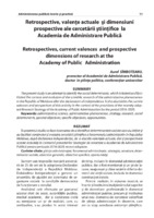 Retrospective, valențe actuale și dimensiuni prospective ale cercetării științifice la Academia de Administrare Publică În prezentul studiu se face încercarea de a identifica determinantele sociale care au inițiat și au facilitat conținutul și evoluția cercetării științifice a fenomenului administrativ în Republica Moldova, după declararea Independenței, de a elucida valențele actuale, dar și perspectivele acestei activități în contextul prevederilor Strategiei de cercetare a Academiei de Administrare Publică pentru perioada 2016-2020, recent adoptate.