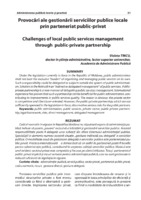 Provocări ale gestionării serviciilor publice locale prin parteneriat public-privat Cadrul normativ în vigoare în Republica Moldova nu stipulează expres că administraţia publică trebuie să poarte „povara” exclusivă a înfiinţării şi gestionării serviciilor publice. Această responsabilitate poate fi delegată unor subiecţi din afara sistemului administraţiei publice. Specialiştii în domeniu numesc această situaţie „gestiune indirectă sau delegată” a serviciilor publice. O modalitate nouă de gestionare delegată a serviciilor publice este parteneriatul public-privat. Practica internaţională a demonstrat că un astfel de parteneriat poate fi benefic pentru administraţia publică, contribuind la creşterea calităţii serviciilor publice. Motivul este unul evident: sectorul privat este competitiv şi focusat pe client/utilizator. Totuşi parteneriatul public-privat implică şi riscuri serioase pentru administraţia publică, care nu sunt gestionate în măsură suficientă de legislaţia în vigoare.