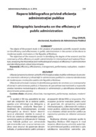 Repere bibliografice privind eficiența administrației publice Obiectul prezentului demers ştiinţifc îl formează analiza studiilor referitoare la cercetarea sistemică a efcienței şi efcacității în administrarea publică în contextul dezideratului de modernizare a instituţiilor publice din Republica Moldova. Obiectivele articolului constau în identifcarea gradului de cercetare şi a controverselor efcienței în administrarea publică, în literatura de specialitate internaţională şi naţională; analiza teoretico-metodologică a efcienței în administrație şi identifcarea elementelor determinante pentru acestea.