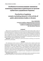 Особенности использования элементов комплекса маркетинга в деятельности органов публичного управления Украины На современном этапе развития Украины в деятельности органов публичного управления внедряются множество практик, которые активно используются представителями сферы бизнеса. Одной из таких практик является маркетинговая деятельность. В статье предлагаются к рассмотрению теоретические аспекты маркетинга, которые могут быть применимы в деятельности органов публичного управления. Отмечаются фундаментальные отличия сферы публичного управления и бизнеса в этом контексте. Анализируются основные элементы комплекса маркетинга и отмечаются свойства маркетинговых инструментов применительно к сфере публичного управления.