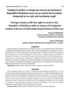 Cetățenii străini cu drept de muncă pe teritoriul Republicii Moldova care nu au statut de lucrători imigranți și nu cad sub incidența Legii Printre cetățenii străini, care se află în mod legal pe teritoriul Republicii Moldova în scop de muncă, există mai multe categorii de astfel de persoane care în realitate beneficiază de un statut juridic special, fiind reglementat prin alte acte juridice. În Legea RM nr. 180 privind migrația forței de muncă sunt identificate 12 categorii de străini care nu intră sub incidența acestei legi și, prin urmare, nu pot fi tratate ca lucrători imigranți. În lucrarea noastră am clasificat aceste categorii de străini în 4 blocuri: a) în funcție de o anumită profesie, activitate, b) în conformitate cu o profesie și o perioadă determinată de activitate în R. Moldova, c) în funcție de condițiile tratatului internațional și d) în funcție de alte circumstanțe.