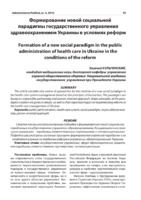 Формирование новой социальной парадигмы государственного управления здравоохранением Украины в условиях реформ Статья посвящена рассмотрению подходов к формированию новой социальной парадигмы в государственном управлении здравоохранением, базирующаяся на принципах гуманизма, - парадигмы ответственного партнерства и человекоцентризма. Подробно рассмотрены основные принципы формирования указанной парадигмы и их ожидаемое влияние на внедрение реформ в управлении здравоохранением Украины.