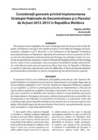 Considerații generale privind implementarea Strategiei Naționale de Descentralizare și a Planului de Acțiuni 2012-2015 în Republica Moldova În prezentul articol sunt evidențiate principalele provocări pe care Guvernul Republicii Moldova le întâmpină în procesul de implementare a Strategiei Naționale de Descentralizare adoptate în 2012. Recent, Parlamentul Republicii Moldova a adoptat un act legislativ cu privire la prelungirea perioadei de implementare a Planului de Acțiuni pentru realizarea completă a Strategiei menționate. Prin urmare, la ora actuală, este crucial de a se identifica cele mai bune soluții în sensul finalizării procesului de implementare a Strategiei și de a crea o administrație publică mai sustenabilă, mai transparentă și mai eficientă cu instrumente funcționale și o autonomie reală. Mai mult decât atât, pentru Republica Moldova este necesar de a se interveni urgent și de a depăși dificultățile legate de descentralizarea financiară și cea patrimonială, precum și de consolidare a capacității administrative.