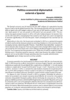 Politica economică diplomatică externă a Spaniei Economia spaniolă a fost lovită puternic la sfârşitul anului 2007 de criza financiară globală. În 2009 economia se afla în mod oficial în recesiune, bugetul Spaniei, care înainte de criză avea un surplus de 3 la suta faţă de PIB, s-a pomenit cu un deficit de 11,1 la sută. Spania a obţinut o creştere de 0,1 la sută în 2010 şi de 0,7 la sută - în 2011. Economia a intrat încă o dată în recesiune în 2012, cu perspectiva unei modeste prognoze de recuperare pentru 2013 şi 2014. Rata şomajului a crescut cu peste 25 la sută şi nu se aşteaptă să scadă în mod semnificativ în următorii câţiva ani. Şomajul în rândul tinerilor a ajuns la peste 50 la suta. Ca răspuns la criză, Guvernul a lansat în 2010 un program substanţial de reforme şi măsuri de austeritate care vizează corectarea dezechilibrelor din economie şi încurajarea redresării, îmbunătăţirii finanţelor publice. Miniştrii de finanţe din zona euro au (The Eurogrup) au stabilit Guvernului o ţintă de deficit bugetar de 6,5 la sută din PIB pentru 2013 şi 5,8 la sută pentru 2014, care se încadrează în obiectivul dorit de 3 la sută până în anul 2016. Eurogrup a oferit, de asemenea,100 miliarde de euro credit pentru recapitalizarea sectorului bancar din Spania. Măsurile de austeritate succesive, care au devenit obiectul unor proteste populare, au ca obiectiv reducerea deficitului prin reduceri de cheltuieli în administraţia.