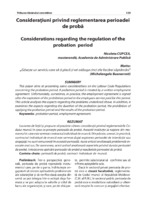 Consideraţiuni privind reglementarea perioadei de probă Lucrarea de față îşi propune să prezinte câteva considerații privind reglementările Codului muncii în ceea ce priveşte perioada de probă. Această instituţie ia naştere din momentul în care este semnat contractul individual de muncă. Din păcate, uneori, în practică, contractul individual de muncă este semnat după expirarea perioadei de interdicție sau angajații nu sunt remuneraţi în această perioadă. Acest articol analizează problemele invocate mai sus. De asemenea, acest articol analizează aspectele privind durata perioadei de probă, interzicerea aplicării perioadei de probă şi rezultatele perioadei de probă.
