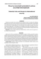 Riscuri și amenințări potențiale la adresa securității internaţionale Astăzi, putem afirma cu certitudine că, la începutul secolului al XXI-lea, provocările la adresa mediului actual de securitate tind să devină din ce în ce mai difuze, puţin predictibile şi multidimensionale, constituind atât o caracteristică externă a securităţii cât și una internă și, desigur, devenind parte componentă indispensabilă a politicilor şi strategiilor de securitate. Din aceste considerente, a crescut necesitatea de cooperare internaţională ca fundament pentru asigurarea stabilităţii mediului de securitate care trebuie să asigure sentimentul de încredere şi de linişte, prin garantarea absenţei oricărui pericol, atât pentru individ cât şi pentru comunitatea din care acesta face parte [2, p.1].