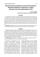 Mecanismele de activitate e-guvernamentală din Republica Moldova comparativ cu cadrul decizional de internaţionalizare al UE Reuşitele e-guvernamentale macrosistemice denotă oportunizarea macro- şi micromediilor decizionale implementând şi aplicând o multitudine de mecanisme şi instrumente care, fiind diversificate, contribuie la fortificarea opiniei publice comune. Ciberadministrarea dezvoltă cele mai importante mecanisme de consolidare a uniformizării e-guvernamentale a micromediilor, nemijlocit, Republica Moldova fiind parte componentă şi participativă la evoluţionarea e-guvernării decizionale microsistemice similar directivelor vectorilor macrosistemici.