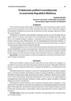 Problemele politicii investiţionale în economia Republicii Moldova Politica de investiţii a statului este de a dezvolta un set de măsuri de atragere a investiţiilor în economie. Direcţiile de bază ale politicii de investiţii în Republica Moldova, pentru a asigura realizarea obiectivelor strategice ale Moldovei, sunt reflectate în acest articol. Analizând situaţia din republică, sectorul de investiţii poate formula factori negativi pentru a atrage investiţii în dezvoltarea antreprenoriatului în Moldova: situaţia politică instabilă, corupţia şi birocraţia, lipsa de resurse umane calificate, infrastructura modestă etc. Pentru dezvoltarea climatului investiţional, este necesar să se îmbunătăţească managementul administraţiei centrale şi locale, pentru a ajuta investitorii la fiecare etapă a procesului investiţional. Următoarele sectoare prioritare ale economiei naţionale pentru atragerea investiţiilor pot fi evidenţiate: servicii pentru antreprenori, dezvoltarea produselor tehnologiilor informaţionale, dezvoltarea industriei electronice, dezvoltarea industriei uşoare, producerea de piese pentru automobile, sectorul agroindustrial, turismul, logistica în transport.