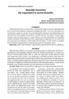 Abordări teoretice ale organizării în sectorul public Administraţia publică, ca activitate, se realizează printr-o multitudine de forme organizatorice care grupează categorii întregi de oameni (personalul). La rândul său, sistemul administraţiei publice este un sistem de organizare socială bazat pe relaţii care există între aceşti oameni care realizează o activitate specifică. Acest sistem de organizare socială există şi funcţionează în cadrul unui macrosistem de organizare socială a societăţii globale. Aprecierea eficienţei organizării este în funcţie de rezultatele acesteia şi se regăseşte în eficienţa activităţii din administraţia publică. În acest articol analizăm unele abordări teoretice privind organizarea în sectorul public.