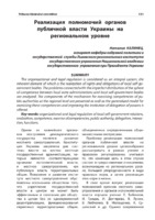 Реализация полномочий органов публичной власти Украины на региональном уровне The organizational and legal regulation is considered as an integral system, the inherent element of which is the realization of rights and obligations of local self-government bodies. The problems connected with the imperfect distribution of the sphere of competence between local state administrations and local self-government bodies are analyzed. The components of the mechanism for exercising competencies of public authorities at the regional level are presented as well as the generalized model for exercising these competencies and improving the institution of delegation of powers is offered.
