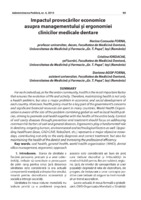 Impactul provocărilor economice asupra managementului și ergonomiei clinicilor medicale dentare For each individual, as for the entire community, health is the most important factor that ensures the evolution of life and activity. Therefore, maintaining health is not only a health problem, but also a major problem in economic and social development of each country. Moreover, health policy must be a key part of the government’s concerns and significant financial resources are spent in many countries. World Health Organisation is aware of the size of the problem combining global as well as local health policies, aiming to promote oral health together with the health of the entire body. Control of oral cavity diseases through prevention and treatment should focus on addressing common risk factors of oral and general diseases. Ergonomics play a fundamental role in dentistry, targeting human, environmental and technological factors as well. Upgrading healthcare (laser, CAD-CAM, RoboDent, etc.) represents a major objective nowadays, contributing not only to the early diagnosis and correct treatment, but also for maintaining the health of the dentist and increasing the professional efficiency.