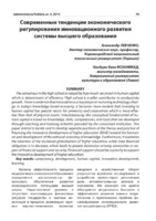 Cовременные тенденции экономического регулирования инновационного развития системы высшего образования The consensus in the high school is valued by how much we invest in human capital which is determinant of efficiency. High school is a pillar contributor to productivity growth. There is evidence that innovation is a key player in nurturing technology change. In today’s knowledge based economy, it becomes more evident that investing in human capital has greater return for university and corporation which is more effective than that of physical assets. Simultaneously, the conceptual fundamental of human capital is based on knowledge, skills, competencies, and tools that are developed through coaching and learning activities provided by the concerned institution. This paper intend to tackle and to develop separate positions of the theory and practice of financing the innovative development of higher education (IDHE) toward the formation and development of the national economy of knowledge. Furthermore, it examines the retention of the increased globalization of higher education, while state financial obligation is in decrease, which leads to greater distinction among universities in respect of financial support and security. Financial support should be a priority to support the innovative development of higher education.