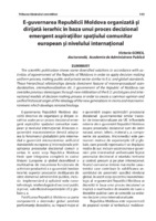 E-guvernarea Republicii Moldova organizată şi dirijată ierarhic în baza unui proces decizional emergent aspirațiilor spațiului comunitar european și nivelului internațional The scientific publication shows some diversified solutions in accordance with activities of egovernment of the Republic of Moldova in order to apply decision making uniform process, making public and private sector similar to E.U. and global standards. These hierarchical relationships denote dominant feature of macro-procedural standardization, internationalization etc. E-government of the Republic of Moldova can overtake previous stereotypes through new infiltration of the E.U. prototypes and international models of decision making process in order to create a common opinion and unified historical origin of the ideology of the new generations in micro and macroenvironment which develops nanotechnology.