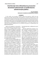 Interferenţe între eficientizarea procesului decizional administrativ şi modernizarea administraţiei publice In this article, we are going to discuss about two processes, which are very important for public administration, with references to decision-making process, and modernization of public administration. We’ll study if between these two processes are any relations, and if they are, how these relations can affect any of these two processes. We’ll search if the process of modernization of public administration implies also the improvement of administrative decision-making process. In the same context, we’ll study how decision-making process can influence de process of modernization the public administration.
