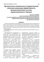 Приоритетные направления государственной политики повышения эффективности функционирования системы здравоохранения в Украине The article considers the main problems and shortcomings of the current system of health care in Ukraine, the main advantages, disadvantages and risks of change, the basic problems standing in the way of introducing the system of compulsory medical insurancein Ukraine. It proposes priority tools to enhance the functioning of the health system in Ukraine.