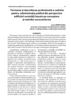 Formarea și dezvoltarea profesională a cadrelor pentru administrația publică din perspectiva edificării societății bazate pe cunoaștere și valorilor euroconforme The present study examines the role of Academy of Public Administration in building knowledge-based society from the perspective of state policy promotion in public administration field, training and professional development of civil servants based on European values system and challenges which public administration goes through at the moment. With Master degree studies and possibilities offered by the Academy in continuing professional development, civil servants become possessors of skills that allow them to tend in their function to the rigors of European management.