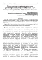 Коммуникационные возможности и условия реализации разнообразных форм гражданского участия в современном обществе A concept «Civil participation» is examined as a necessary constituent of process of democratic transformations in society. The various forms of such participation and expansion of terms and possibilities of their realization are analyses in modern informative space.