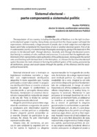 Sistemul electoral – parte componentă a sistemului politic The population of any country, including the Republic of Moldova, is in the right to choose the electoral system it wishes, being firmly convinced that the chosen system will meet the expectations. Unfortunately, a large amount of people, due to both subjective and objective factors dont fully comprehend the importance of one or another electoral system. First of all, in a democratic country, it is ment to keep the peoples sovereignty, giving it the lead role in this process to the electoral staff , through elections. Secondly, only through the electoral system, that basicly is a entirety of rules, methods and processes, it is assured that the legitimate establishment of teh representative state authorities of the political power, starting with the central ones and finishing with the local level. In the third place , it is known the fact that the electoral system becomes the main element in forming the political system of the society, presented by all institutions, groups and social classes through the parties, of the alliances and the sociopolitical movements.