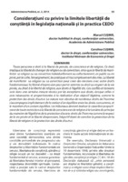 Consideraţiuni cu privire la limitele libertăţii de conştiinţă în legislaţia naţională şi în practica CEDO Toute personne a droit à la liberté de pensée, de conscience et de religion. Ce droit implique la liberté de changer de religion ou de conviction, ainsi que la liberté de manifester sa religion ou sa conviction individuellement ou collectivement, en public ou en privé, par le culte, l’enseignement, les pratiques et l’accomplissement des rites. La liberté de manifester sa religion ou sa conviction peut creer des tensions avec autre droits fondamentaux: la liberté d’expression peut porter atteinte au droit au respect de la vie privée, au droit à la liberté de religion, aux droits à l’égalité etc. Ces conflits et tensions sont dans une certaine mesure résolus par les exceptions aux droits, lorsque celles-ci sont nécessaires et proportionnées à la réalisation d’un objectif légitime, comme la protection des droits d’autrui. La nature non absolue de nombreux droits de l’homme s’accompagne implicitement de la notion d’un équilibre entre les droits concurrents, et le maintien d’un certain équilibre. Les tribunaux devront évaluer le caractère proportionné de toute restriction à la liberté de conscience et de religion à la lumière du principe du maintien de l’égalité et de la protection d’autres droits de l’homme comme le respect de la vie privée et la liberté d’expression, l’objectif étant de concilier la protection de la liberté de religion et la protection des droits d’autrui.