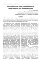 Детерминанты преступлений против нравственности в сфере культуры The article is devoted to the problem of definition of causes and conditions (determinants) of committing crimes against morality in cultural sphere. Have been identified main determinants of every crime of this type. On the basis of this research were allocated causes and conditions of crimes against morality in cultural sphere in the complex.