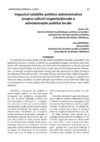 Impactul relaţiilor politico-administrative asupra culturii organizaţionale a administraţiei publice locale It is obvious that every policy change entails significant changes, especially in the leadership positions. Practice is difficult to acceptable European standards and other states with consolidated democracy, but that seems to perpetuate us despite pressure from international bodies. It is true that in recent years it has experienced an attenuation, so through successive legislative changes but also because of a slight change in the attitude of the political class. Yet many of those who have been replaced by political criteria based access in the same manner and accept this change as a natural fact. There are many situations in which attempts presentation of removal from office due to incompetence, or some people leave the public to the private sector where higher revenues.