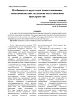 Особенности адаптации заимствованных политических институтов на постсоветском пространстве In the article the role of political institutions that were imported in transitive political systems of post-Soviet space is analyzed. The modern approaches of analysis of institutional transformations in transitive societies are used. The author grounds the features of the social actors` adaptation process to the institutional forms that were imported.