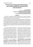 Dimensiunea transparenţei administrative – oportunitate amplificată de dispozitivele comunicaţionale This paper is studying administrative transparency as an output of a long-term evolution and constant efforts to promote citizen best interest in the public affairs by ensuring and enforcing access to the information. Current changes in approaching administrative transparency’s concept are nothing but a reaction to the crisis of the authoritarian state as well as to the establishment of representative democracy, as well as to the necessity to reevaluate citizen’s role and position in the decision-making process in the Republic of Moldova. Furthermore, opinions stated in the present paper are mostly founded on the idea that currently, the dimensions of the administrative transparency are amplified by numerous communicative tools, dictated by the public administration reform in the Republic of Moldova.