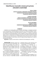 Valorificarea resurselor umane prin prisma stimulării creativităţii Creativity is an inexhaustible source of power and energy, is a progress key factor in the contemporary world development and which can tackle any problem. Promoting individual creativity, but especially collective creativity, is a solution for mankind as a chance of survival and progress. In turn creativity is not just receiving and using again, but first, creating the new. People create because they feel the need of essential development, by writing they grow intellectually and by producing they must already hold the knowledge. To solve various crises for implementing changes also it is need to stimulate the creativity.