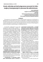 Unele referinţe privind asigurarea accesului la informaţie şi transparenţei în procesul de administrare The application of the legal framework on administrative transparency in the Republic of Moldova, here we refer to the Law on access to information, including the transformation of the administrative culture into a democratic and transparent one, raises essential obstacles at present, especially for the countries with vulnerable economies, that have a limited budget for putting into practice a general program of additional measures.