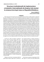 Structura instituţională de implementare a tratatelor internaţionale de drepturi ale omului în sistemul de drept intern al Republicii Moldova The institutional arrangement for the implementation of human rights treaties to which the Republic of Moldova is a party within the Moldovan legal order appears to be both a multidimentional and a centralised one. It is of a multidimentional character because many governmental institutions are involved in the process of implementation of such treaties. The primary responsibility of implementing or overseeing the implementation of a human rights treaty lies with the ministry or other central governmental institution whose powers relate to the subject matter covered by that treaty. The Ministry of Foreign Affairs and European Integration (MFAEI) and the Ministry of Justice play a specific role in this process. If the MFAEI has a coordination and a overseeing function on how other ministries and central governmental institutions fulfill the obligations arising from the human rights treaties under their competence, the Ministry of Justice reviews the conformity of all draft bills containing new legislation with the human rights treaties to which the Republic of Moldova participates. Furthermore, there are other interministerial bodies with powers in the field of implementation of human rigths treaties. At the top of this interministerial structure is the National Committee for the drafting of initial and periodic reports regarding the implementation of international treaties to which the Republic of Moldova is a party. Its main function is to exercise the governmental control on the observance of international treaties by our country. This is namely this responsibility given to that Committee that makes the national arrangement for the implementation of human rights treaties to have a centralised character.