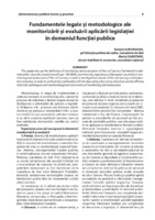 Fundamentele legale şi metodologice ale monitorizării şi evaluării aplicării legislaţiei în domeniul funcţiei publice This paper sets up the definition of monitoring and evaluation of the civil service framework implementation since the enactment of Law 158/2008, examines the experience of European countries in monitoring and evaluation of the civil service, as well as the legal framework of the monitoring and evaluation activities, in order to achieve the conformity with the law and performance of civil service by offering methods, techniques and methodological instruments of monitoring and evaluation.