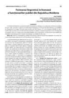 Formarea lingvistică în franceză a funcţionarilor publici din Republica Moldova L’ initiative d’intégration européenne impose des exigences politiques et sociales dans la fonction publique de notre état. Une de ces rigueurs est la formation linguistique en français des fonctionaires. Les modalités de dispersion de la langue française sont animées par l’état français via ses structures habilitées et disséminées dans les institutions de l’administration publique moldave, impliquées dans le processus d’intégration européenne. Dans ce contexte, il est nécessaire d’élaborer des cursus ad hoc, conformément aux validités des standards internationaux bien reconnus et adaptées aux réalités de chez nous.