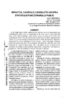 Impactul cadrului legislativ asupra statutului funcţionarului public At the beginning of public administration reforms, one of its main goals was rebuilding the public service, relinquished to the state service system inherited from soviet times,molding it after public service systems in the West. The predominant trend is the decentralization of functions of public administration reform. It is an increasingly pronounced need to create the necessary legislative . framework for career training of civil servants, with a thorough training, | politically neutral and able to meet promptly and effectively what they have been f entrusted by virtue of their status, thus , the public service is based on the 60 principles of stability, professionalism, impartiality, transparency and efficiency, I designed to meet the demands of society and state in general.