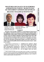Pregătirea specialiştilor în domeniul administraţiei publice în instituţiile de învăţământ superior din Republica Moldova: realizări şi perspective Intentions of the Republic of Moldova to join European Union request new challenges related to the training and formation of the staff in the public administration. In this context, it is necessary to establish and strengthen a modern system of training the specialists in public administration that would be in line with the European standards and needs of the society. The present material shows the results of the research on Evaluation of the needs in University education, post graduated studies, PhD degree education, as well as research field in public administration and good governance”, made by the authors.