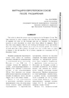 Миграция в Европейском Союзе после расширения This article is about the present state of migration in the European Union. The fears expressed by some countries that after the last enlargement a big amount of migrants will enter on the Schengen area are not founded. The European economy is now dependent on cheap labor force offered by migrants. More than that many migrants that are now working in European Union old member states will return to their countries as a result of economic growth. The results of pools show that a little percent of people from new member states are ready to migrate to the old members. So in present, migrants are a necessary evil for European Union.