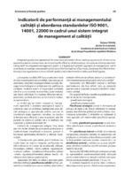 Indicatorii de performanţă ai managementului calității și abordarea standardelor ISO 9001- 14001-22000 în cadrul unui sistem integrat de management al calităţii Integrated quality management of the external environment allows meeting requirements of internal organization and its environment, on increasing the efficiency of all processes, focusing on training and motivating staff. An integrated management system is a logical and systemic approach to management, which contributes to strategic and operational decisions that best address all key issues, leading to the effective functioning of an organization in terms of both quality and environmental or safety and food hygiene.