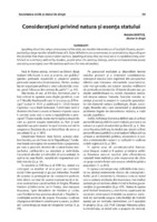 Consideraţiuni privind natura şi esenţa statului Speaking about the nature and essence of the state, we mention the existence of multiple theories, accompanied by a large number of definitions of it. State definitions are as numerous as contradictory, depending on the doctrine that share some or other authors. Speaking of state, first, we must see in it a political entity, established on a territory defined by borders, people whos the territory belongs, and an institutionalized power exercising sovereignty over the territory and over the rules of conduct.