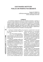 Gestionarea instituţiei publice din perspectiva umanistă In Occidental managerial practice, the humanist perspective is already an alternative in the framework of decisional system of organizations. The administration of public institutions from the humanist perspectives is a psycho-pedagogical category, which expresses the power or weight of animator in forming and strengthening community and which vises the final result of the process of public authorities’ administration. It represents the conception, compulsoriness and galvanizing phenomenon of facilities in becoming leader.
