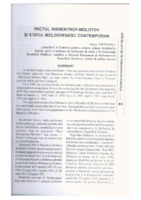 Pactul Ribbentrop-Molotov și Statul Moldovenesc contemporan In the last decades, many politicians, historians, political analysts from Moldova and abroad, especially from Romania, display constant interest for the so-called "Ribbentrop-Molotov Pact", or more exactly the Soviet-German treaty of Non-aggression and its additional protocol Since 1989. the political debates on this document in Moldova had and continue to have political connotation It is worth mentioning that the Parliament of the Republic of Moldova approached expressly the topic of Ribbentrop-Molotov pact a number of j times on January 11. 1990. June 19. 1990. June 23. 1990. April 3. 1991. June 26-28. 1 1991. and August 27. 1991. The adopted decisions of the Parliament of the Republic of Moldova on this issue 21 have profoundly marked the fate of our state. Some politico-juridical confusions have been created, which have been perpetuated in the Declaration of Independence of the Republic of Moldova.