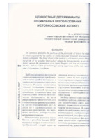 Цeннocтные дeтepминанты coциaльныx пpeобpaзований (иcтopиocoфcкий acпeкт) The article is devoted to the problems of the philosophy of history the urge of which is proved by the course of intellectual and historical development human community The direct object of the analysis is a historical process throw the prism of its valuable bases which reflect the foreshortening in which his ton' acts as the preservation of it bases Progress acts here as a statement in the new. and as a feat of awakening lasting importance of the truly value even if it concerns a tradition.