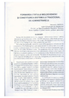 Formarea statului Moldovenesc și constituirea sistemului tradiţional de administrare (I) Staring with the present article, the magazine ' Administrate Publica (Public Administration) launches a new rubric "The 650th anniversary of the Moldovan State' Based on the Degree of the President of the country, this important event in the life of our state will be marked for the whole period of the year 2009 The author has profound!) studied the issues of the appearance, evolution and the \ constitution of the Moldovan State and renders not only his point of view on its multi- secular traditional system of administration, but also on issues of paramount importance for the modern Moldovan society. The special role of the ruler Stefan eel Mare (Stephan the Great) in the promotion of the administrative reforms in the Country of Moldova is invoked by pointing out the Contribution of other Moldovan rulers such as Dimitrie Cantemir, scholar and philosopher The article will be continued in issue I of 2008 magazine including new and interesting investigations and conclusions about the tumultuous history of the Country of Moldova.