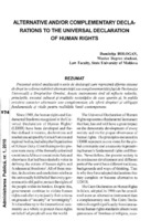 Alternative and/or complementary declarations to The Universal Declaration of Human Rights Prezentul articol analizează o serie de declaraţii care reprezintă diferite sisteme de drept în vederea stabilirii alternativităţii sau complementarităţiifajă de Declaraţia Universală a Drepturilor Omului. Aceste instrumente tind să reflecte valorile, principiile, trecutul cultural şi tradiţiile societăţi/or de care aparţin şi, în pofida oricărui caracter alternativ sau complementar, ele oferă drepturi şi obligaţii fundamentale şi vitale pentru realităţile lumii contemporane.