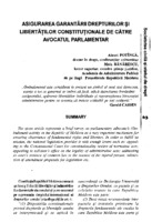 Asigurarea garantării drepturilor şi libertăţilor constituţionale de către avocatul parlamentar The given article represents a brief survey on parliamentary advocates (Оmbudsman) activity in the Republic of Moldova as a very important mechanism for ensuring observance of fundamental rights and liberties. In order to fulfill its mission, the national legislation provides it with enough levers such as: appeal ing to the Constitutional Court for constitutionality review of normative acts; appealing to solicitor s office on the legality of administrative acts; addressing to court's instance of common law in the interest of the injured person; submis sion of amendment proposals for legislation etc.