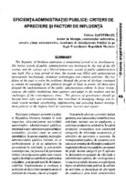 Eficienţa administratiei publice: criterii de apreciere şl factori de influenţă The Republic of Moldova undergoes a transitional period in its development. The Soviet system of public administration was destroyed by the end of the XX century and the carcass of a liberal-democratic system of public administration was built. For a long period of time, the system was filled with authoritarian bureaucratic mechanisms, dominant technologies and control activities. The tra dition of the past to solve the problems through the prism of ideology continued to remain the paradigm of the political thought of those in power. All these have delayed the implementation of the public administration reform. In these circum stances, the public institutions must approve and adapt to the realities and the challenges of the contemporary times. The process of governance should go beyond mere rules and institutions that contribute to managing change and in clude search methods establishing, implementing and assessing human develop ment policies at the highest level of consensus, success and impact.