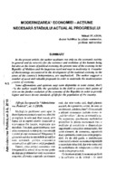 Modernizarea economiei - acţiune necesară stadiului actual al progresului In the present article, the author meditates not only on the economic activity in general and its necessity for the existence and evolution of the human being but also on the issues of political economy, the present state of the economy in the Republic of Moldova and the imperious need and ways to modernize it. A number of shortcomings encountered in the development of the national economy in the years of the country's independence, are emphasized. The author suggests a number of novel and valuable proposals in order to undertake the modernization process of economy. Some affirmations and opinions may seem disputable to some extent, that's why the author would like the specialists in the field to express their points of view on the further evolution of the economy of the Republic in order to provide higher and more decent standards of life for the population of the country.